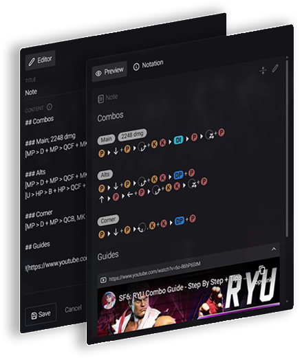 Notes can include text, combos, embeded videos or images and links to external resources.